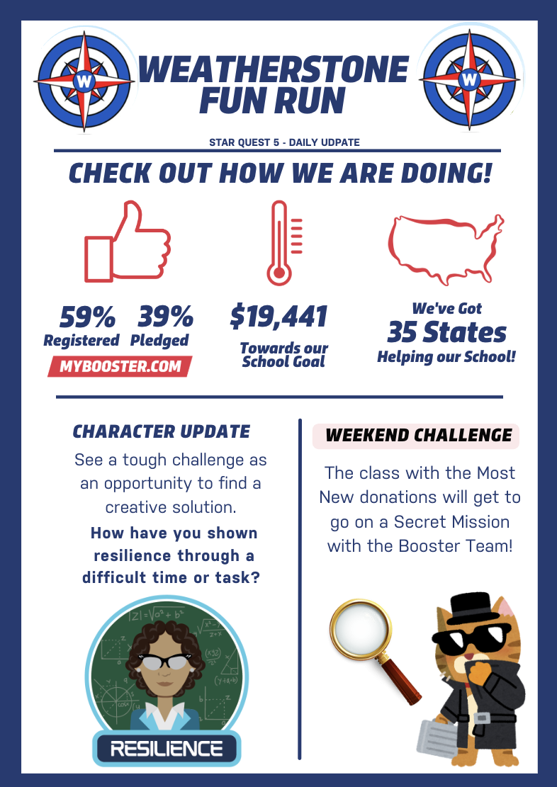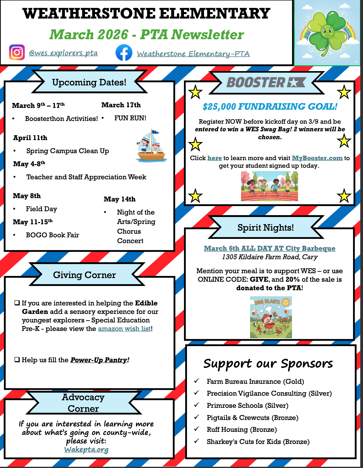 Activities will be ongoing from Monday 3/9 thru Tuesday 3/17. Everyone is invited to the fun run event on Tuesday 3/17, more details to come.